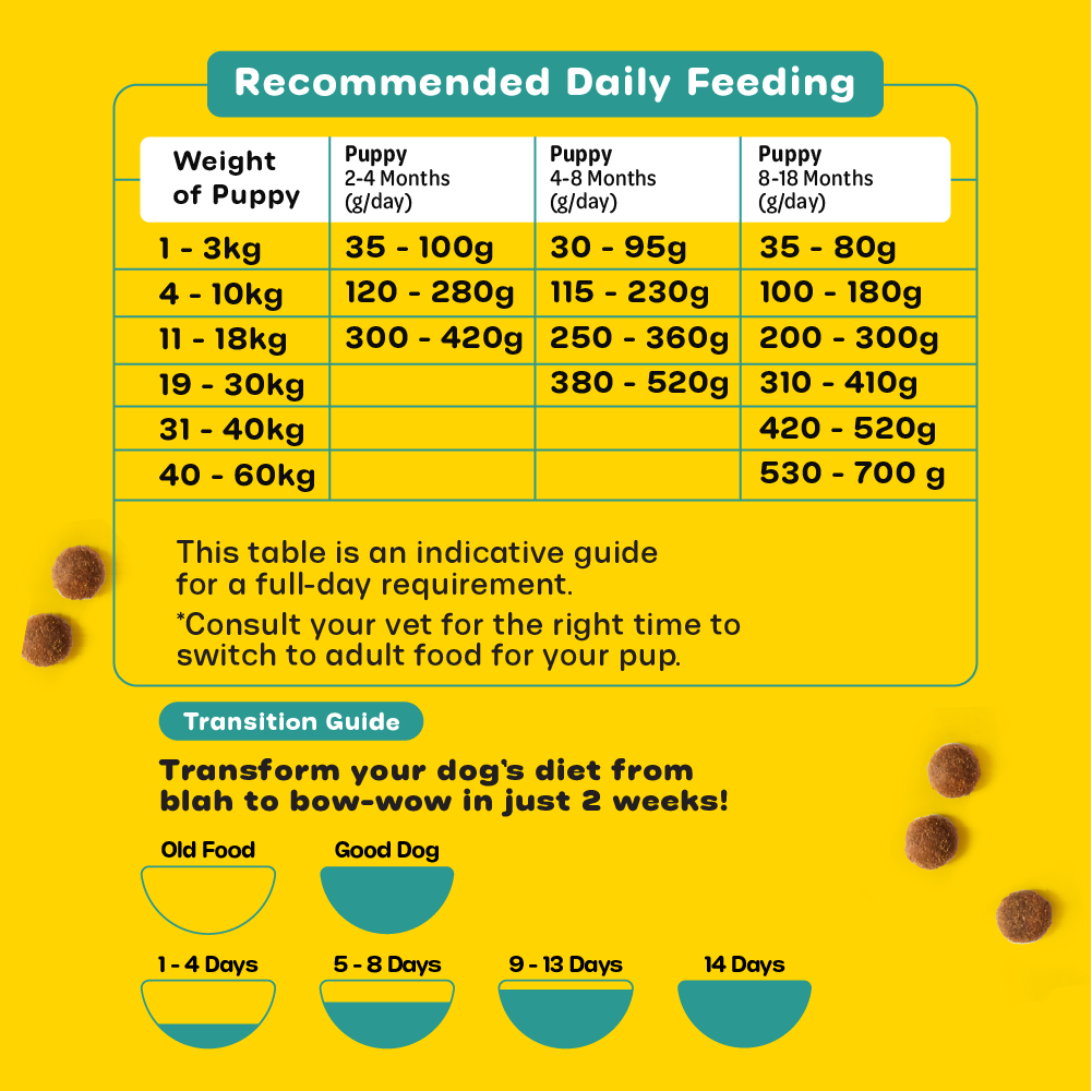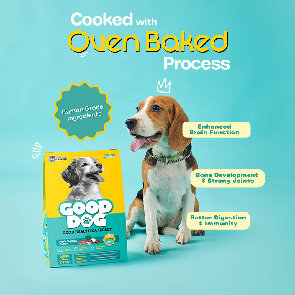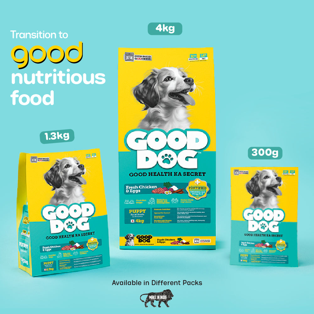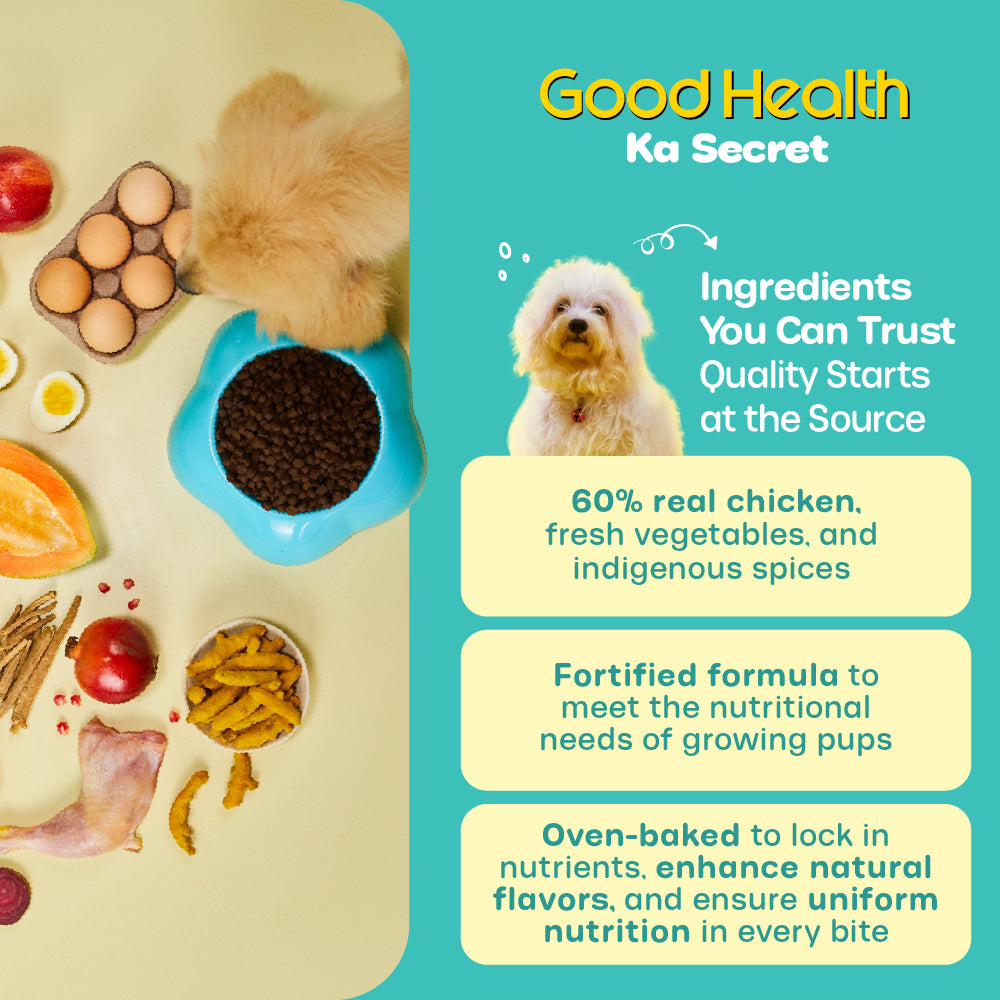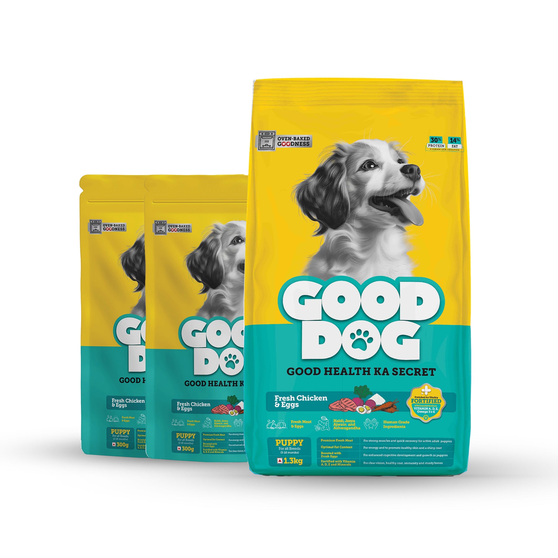 Look for food with high-quality protein (like fresh chicken), essential vitamins and digestible herbs. Good Dog’s Puppy Food is crafted for healthy growth and immunity in Indian puppies.
